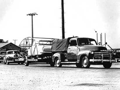 ["Chevy Pick-up, Davis D2 on trailer, Cadillacs"]
